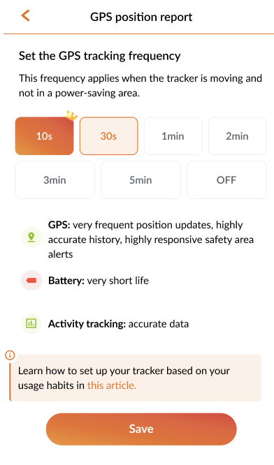 The GPS update frequency has a direct impact on your Tracker’s battery life. A higher frequency provides more precise and responsive tracking, but reduces battery life between charges.